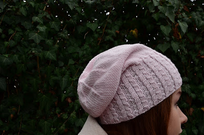 W oryginale jest czapka z szarej włóczki, może nie tak porywająca, moim zdaniem lepiej wygląda w innych kolorach. Przy okazji dowiedziałam się, że taki fason czapki to po angielsku 'slouch hat' - czyli czapka ciamajdy. Ja prywatnie nazywam go 'worek'. 'Barley' zaś znaczy jęczmień i faktycznie warkoczowe kłosy można w ściągaczu dostrzec. Dokładam go więc do grupy zbożowych motywów, razem z kłosami zastosowanymi tutaj przez Sivkę oraz tymi pszenicznymi od Bokasi.