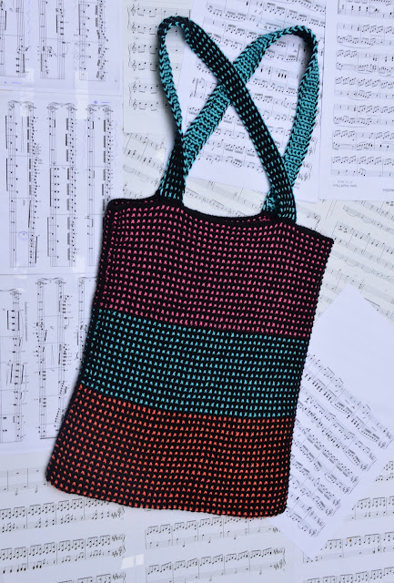 Wymarzyła ją sobie Renia Witkowska, zawodowy muzyk i niezwykła dziewiarka. Stworzyła projekt takiej torby, techniką mozaiki, a przy projektowaniu tak się rozegrała, że opracowała cały plik większych i mniejszych muzycznych motywów do wrobienia. Efekty tej pracy oraz testowe torby możecie obejrzeć na jej blogu oraz na Ravelry, gdzie wzór Musical Mosaic jest do nabycia. Oczywiście duża część moich czytelników już go zna, bo funkcjonujemy w pewnej koleżeńskiej sieci i odwiedzamy się nawzajem 😁 Ale kto nie widział - koniecznie na początek niech tam zajrzy.